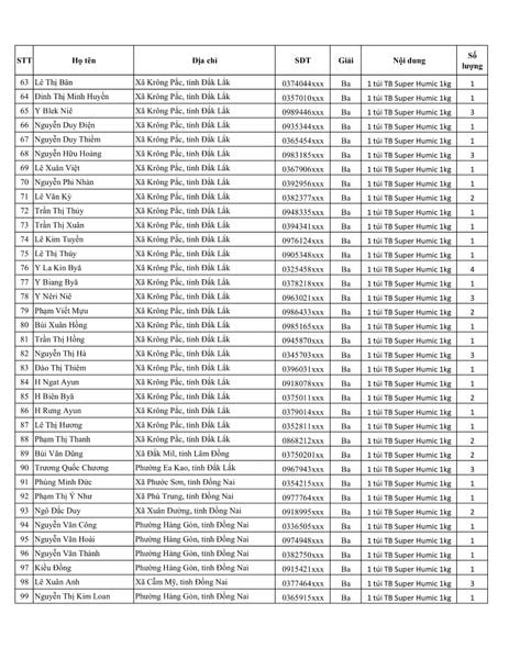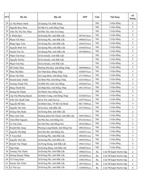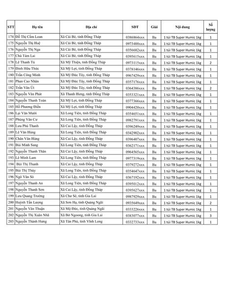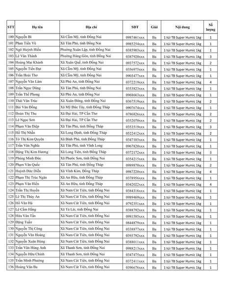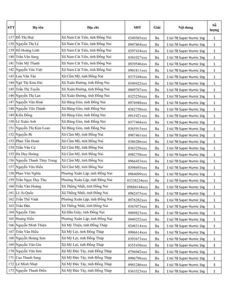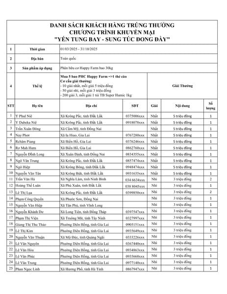 Xin chân thành cảm ơn sự đồng hành, tin tưởng và ủng hộ của quý Khách hàng đối với sản phẩm Phân hữu cơ Happy Farm của công ty TNHH SX - TM TÔ BA. Sau thời gian triển khai chương trình khuyến mại "YẾN TUNG BAY - SUNG TÚC ĐONG ĐẦY" từ 01/03/2025 đến 31/10/2025 và hoàn tất trao thưởng cho các khách hàng trúng thưởng, công ty xin công bố danh sách các khách hàng đã trúng thưởng như sau: